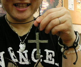 手に持ってる十字架が、なんとドラムのチューニングキーなのである。