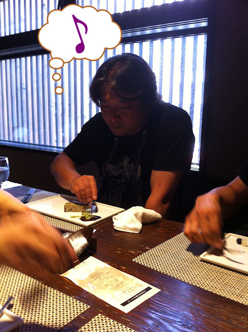 ↓マツモト、上品にデザートのケーキを食べるの図。