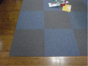 これだと、掃除機にも吸い付かないし汚れてもそこだけ替えることが可能なので便利! それとついでにボロボロの畳を隠してる和室のカーペットがこれまたボロボロになったので こちらも格安6畳用のカーペットを買って来ました。 居間のマットは並べるだけで終わりだけど、和室のほうは 全ての家具をどかして、防虫シートを敷いて、部屋全体にカーペットを敷くのですが 真中に掘りごたつ用の穴を開けなくてはいけません。 なので、全て敷き終った後、カッターでザクザク真中を正方形にカット、カット、カット。 そしてミシンがかけられないので、バイヤステープでひたすらチクチク手縫いで端かがり。