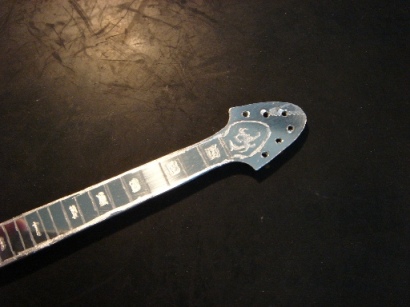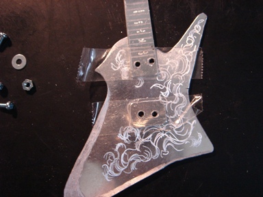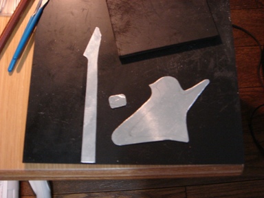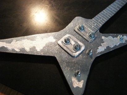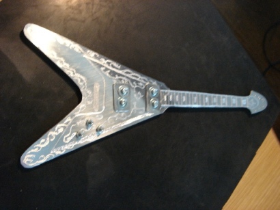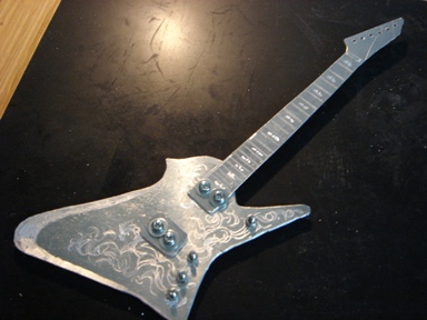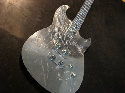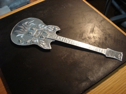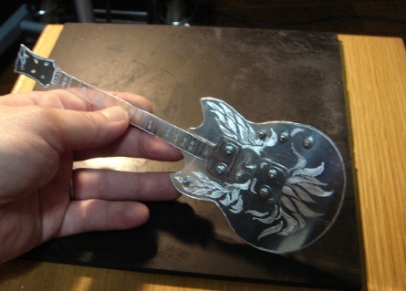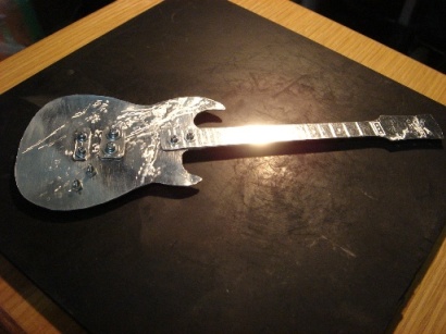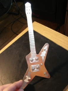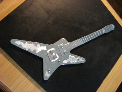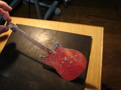 | 2009.6.29 (月) アクセ作りから今度は一変して なぜかアルミでギター作りが始まってしまった。。。(笑) 作り方はいたってシンプル。 アルミ板を金のこで切って、切り口をやすりで削る。 でもこの作業が一番大変で時間がかかり、 右腕が痛くなる。 本来HR-customに模様が入ってるわけではないのですが のぺっとしてつるんとしてるので入れてみた。 そして、ドリルでネジ穴をあける。 ここが一番緊張する。PU部分は2.6mm、スイッチ&ノブ部分は2mm あとヘッドのペグ部分に1.5mm。 完成。 これまでの作品を並べてみます。 YAMAHA SG 山本恭司モデル 大きさはこのくらい。 ESP ランダムスター 高崎晃モデル ↓Tシャツのオレンジがボディに反射。 YAMAHA SF-3000 赤い袋を反射させてみた。 そして、次女から「どうしても作って欲しい」と頼まれていた ESP FV SOUND HORIZONのREVOさんモデル ヘッドも凝ってます。 |