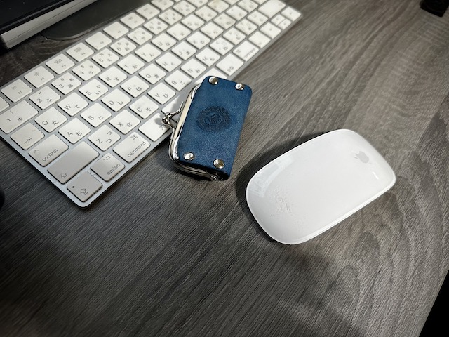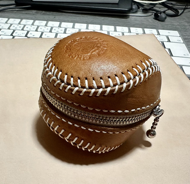 これは、2019年10月のライブのプレゼント用に制作してあった、ボール型の小物入れ。作った当初は、下に敷いてあるヌメ革と同じ色だったのが、作ってから月日が経ち、勝手にエイジングし、新品のくせにこのような味わい深い色に変わってしまったのだ。